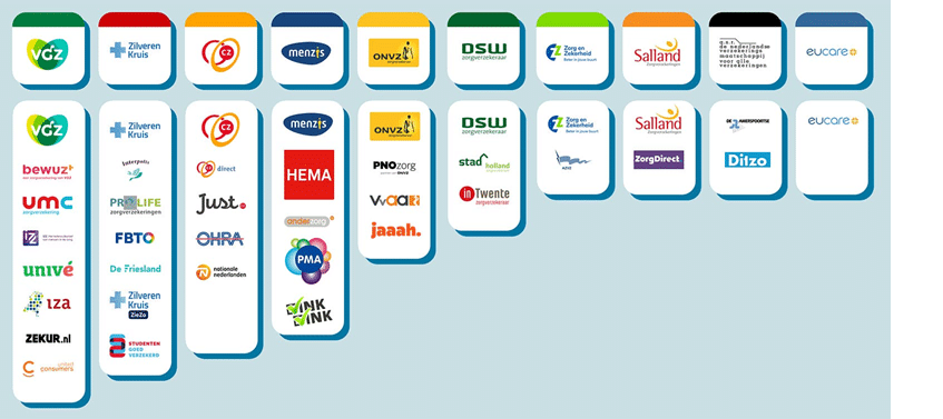 Er zijn ook zorgverzekeraars die geen zorgkostenplafond hanteren: Zorg & Zekerheid, ONVZ, DSW, Caresq en Salland Zorgverzekeraar en alle zorgverzekeraars die hieronder vallen (zie de afbeelding van alle zorgverzekeraars hieronder!). Bij deze verzekeraars hoeven wij het aantal aanmeldingen niet te spreiden over het jaar en zal er in principe geen aanmeldstop worden ingevoerd. Overweeg je om het komende jaar van zorgverzekeraar te wisselen, dan kan je dit wellicht meenemen in je overweging.