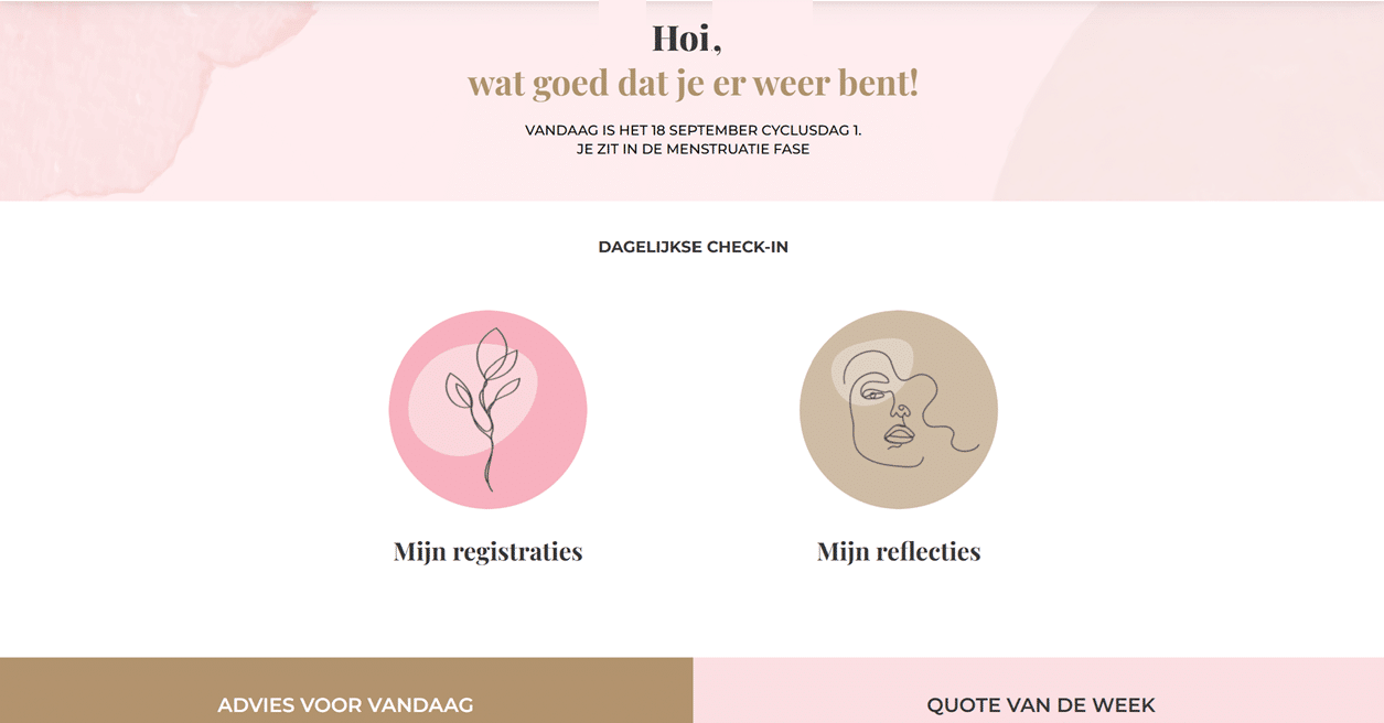 Belangrijk om te weten: je hebt óók een cyclus als je niet (meer) menstrueert, bijvoorbeeld door de overgang, zwangerschap, anticonceptie of een operatie. De Bloom app ondersteunt je ook dan in het zichtbaar maken van patronen, zodat je beter kunt afstemmen op wat jij nodig hebt.